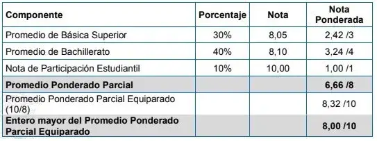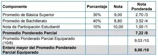 Por lo anterior, considerando el promedio obtenido en el subnivel de Básica Superior, el promedio de los tres años de Bachillerato y la nota del programa de participación estudiantil, se calculará el promedio ponderado parcial, equiparándolo al 100% de la calificación mediante un factor de corrección, de la siguiente manera: